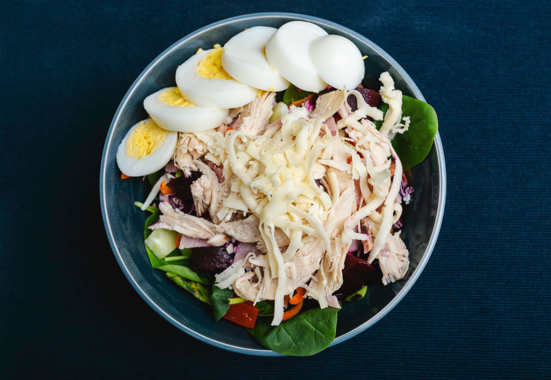 Greens, tomato, carrots, cucumber, red cabbage, pickled beets, red onions, ham, chicken and shredded mozza cheese