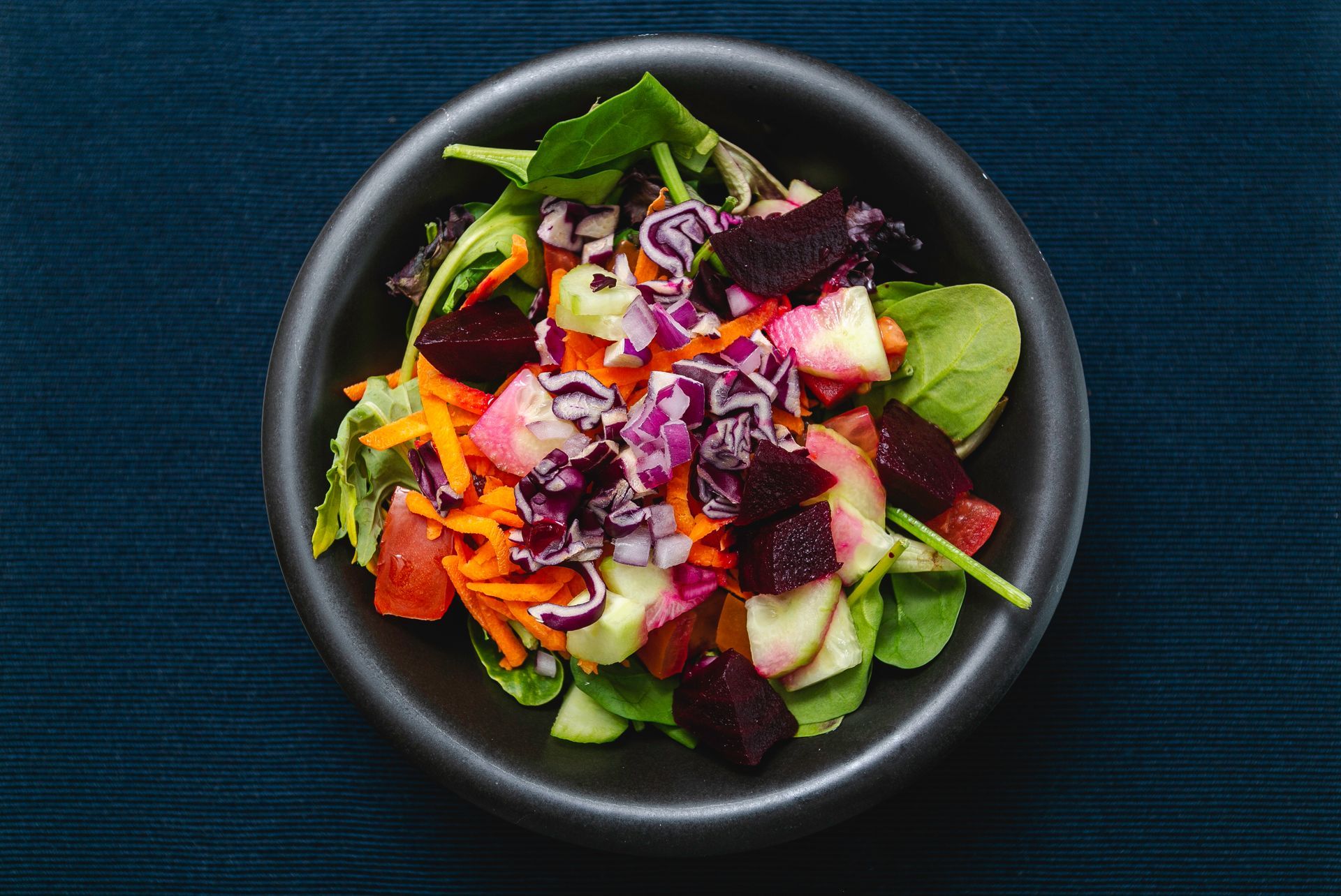 Greens, tomato, carrots, cucumber, red cabbage, pickled beets, red onions